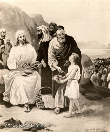 Feeding of the Five Thousand Matthew 14:14-21 Mark 6:33-44 Luke 9:12-17 John 6:3-14 Jesus, testament, feeding, thousand, new, five, miracles, feeds, William Fredericks, D00367 PROJECTION - License for PowerPoint™ PRINT – buy a print of this picture; optional frame Bible Hub |