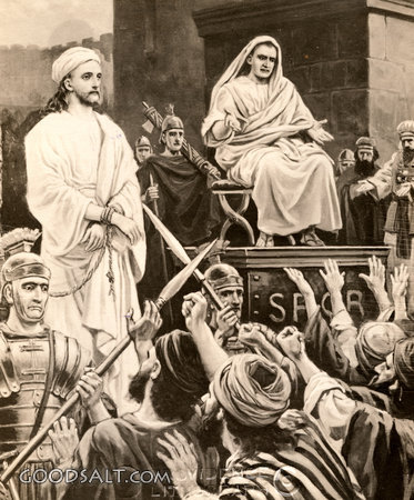 Christ Before Pilate Matthew 27:15-23 Mark 15:6-14 Luke 23:13-22 John 18:39-40 week, christ, Jesus, testament, new, pilate, easter, passion, abused, William Fredericks, Interrogated, Scourged, D00387 PROJECTION - License for PowerPoint™ PRINT – buy a print of this picture; optional frame Bible Hub |