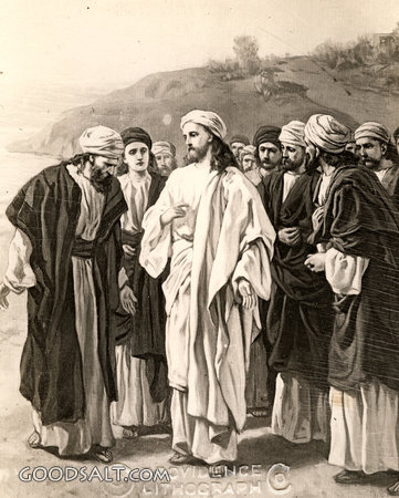 Peter Confesses the Christ Matthew 16:13-20 Mark 8:27-30 Luke 9:18-21 Matthew 16:21-28 Mark 8:31-33 Luke 9:22-27 christ, Jesus, testament, peter, new, simon, disciples, William Fredericks, Confesses, D00482 PROJECTION - License for PowerPoint™ PRINT – buy a print of this picture; optional frame Bible Hub |