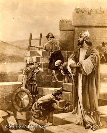 Nehemiah Rebuilds the Wall Nehemiah 4 testament, captivity, old, return, wall, esther, nehemiah, ezra, exile, walls, Charles E. Moore, Rebuilds, D00568 PROJECTION - License for PowerPoint™ PRINT – buy a print of this picture; optional frame Bible Hub |