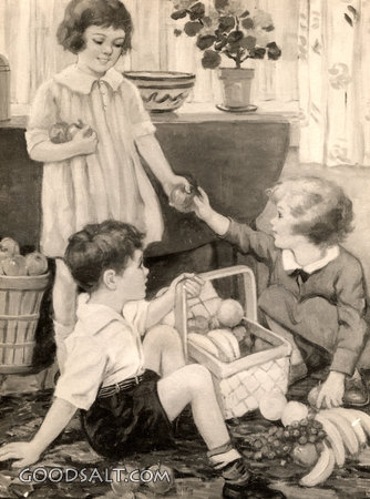 picking, sharing, basket, americana, children, Indoors, Florence Gardiner, D01377