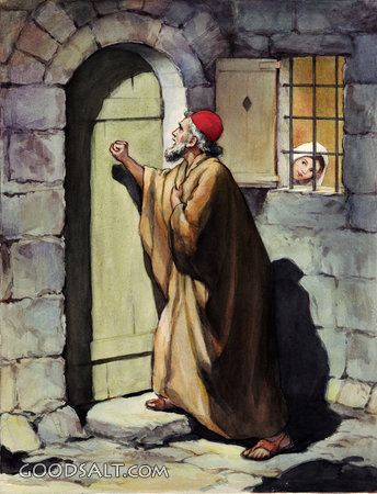 Rhoda Sees Peter at the Door Acts 12 testament, history, church, peter, new, door, escape, prison, judea, samaria, acts, Dorothy Handsaker-Scott, Sees, Rhoda, 01046 PROJECTION - License for PowerPoint™ PRINT – buy a print of this picture; optional frame Bible Hub |