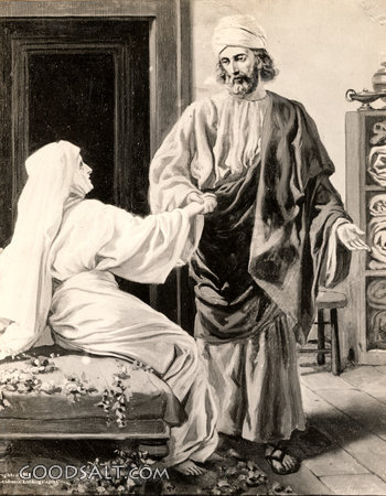 Peter and Tabitha at Joppa Acts 9 testament, dorcas, history, church, peter, new, judea, samaria, acts, Tabitha, Joppa, heals, William Fredericks, D00411 PROJECTION - License for PowerPoint™ PRINT – buy a print of this picture; optional frame Bible Hub |