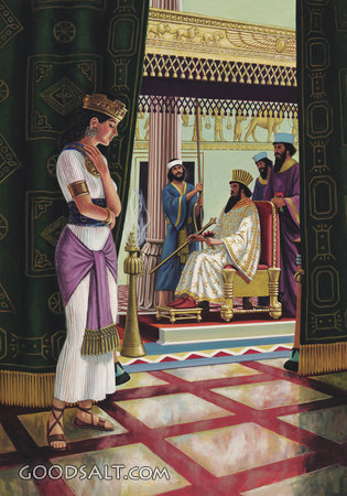 Esther behind Curtain in the King's Throne Room Esther 5 testament, captivity, old, return, king, throne, room, curtain, esther, ezra, exile, Approaches, Woodward Henry, 05007 PROJECTION - License for PowerPoint™ PRINT – buy a print of this picture; optional frame Bible Hub |