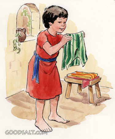 Boy Jesus Folding Garments Matthew 2:19-23 Luke 2:39-40 Jesus, learning, working, bible, folding, child, boy, home, clothing, children, garments, clothes, times, Allen Johnson, 05151 PROJECTION - License for PowerPoint™ PRINT – buy a print of this picture; optional frame Bible Hub |