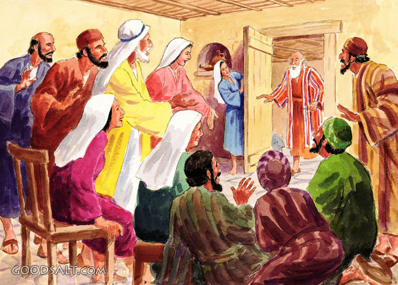 Peter's Friends Pray For Him: Peter inside house Acts 12 inside, testament, history, church, pray, house, peter, new, door, escape, prison, judea, samaria, acts, friends, Allen Johnson, Rhoda, 05738 PROJECTION - License for PowerPoint™ PRINT – buy a print of this picture; optional frame Bible Hub |