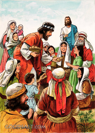 Five Loaves and Two Fishes Matthew 14:14-21 Mark 6:33-44 Luke 9:12-17 John 6:3-14 two, Jesus, testament, new, five, loaves, fishes, miracles, feeds, James E. Seward, 05681 PROJECTION - License for PowerPoint™ PRINT – buy a print of this picture; optional frame Bible Hub |