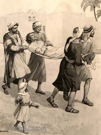 Four Friends Carrying Man Matthew 9:1-8 Mark 2:1-12 Luke 5:17-26 carrying, Jesus, paralyzed, testament, crippled, man, new, roof, friends, Healings, L. Segner, D00229 PROJECTION - License for PowerPoint™ PRINT – buy a print of this picture; optional frame Bible Hub |