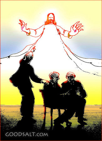 Jesus Standing behind Three Men in Business Suits Psalm 128:2 christ, Jesus, appear, men, honest, nail, corporate, nail print, appearing, male, corporate greed, accountability PROJECTION - License for PowerPoint™ PRINT – buy a print of this picture; optional frame Bible Hub |