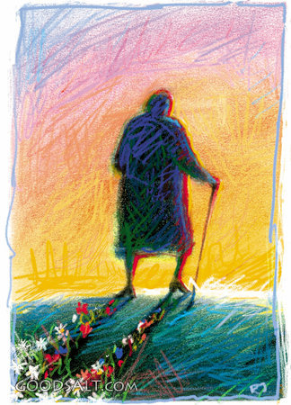 The Silhouette of a Woman With Flowers Growing in Her Shadow 1 Timothy 5:10 leave, leaving, journey, step, footstep, woman, elderly, sunset, shadow, person, foot, path, trail PROJECTION - License for PowerPoint™ PRINT – buy a print of this picture; optional frame Bible Hub |