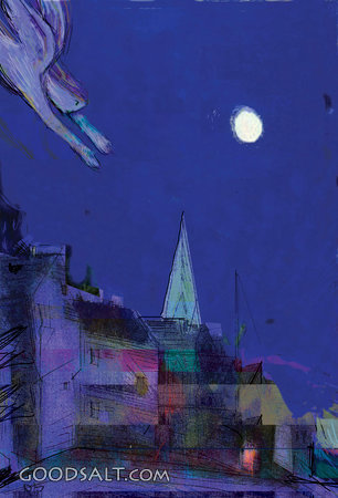 city, angel, flying, sky, dark, darkness, european, moon, town, night, nighttime