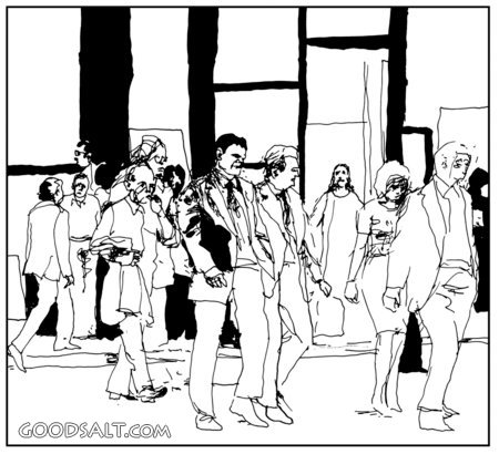 People Walking Away From Jesus John 6:66 conceptual, symbolism, city, lost, people, walk, busy, crowded, modern, black, Jesus, drawing, fine, contemporary, line, downtown, metropolis, symbol, business, life, street, crowd, pen, ink, of, editorial, cartoon, concept, distraction, distracted, unnoticed, terminal, unaware, everyday, congested, congestion, while PROJECTION - License for PowerPoint™ PRINT – buy a print of this picture; optional frame Bible Hub |