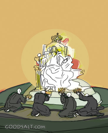 Men Bowing Before Jesus on a Throne Revelation 5:14 Revelation 19:4 bowing, lord, master, messiah, Jesus, kneeling, redeemer, worshipping, crown, king, throne, savior, of PROJECTION - License for PowerPoint™ PRINT – buy a print of this picture; optional frame Bible Hub |