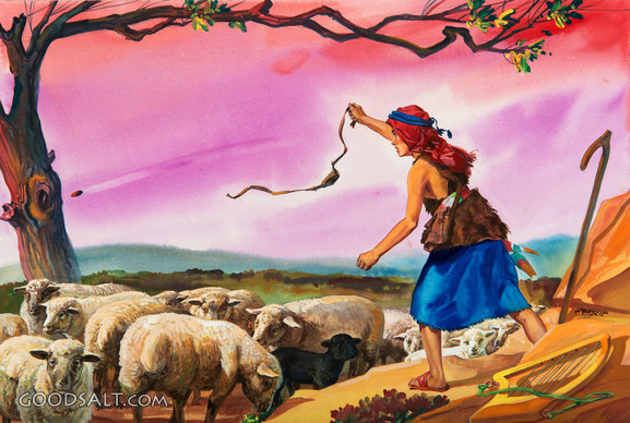 David the Shepherd - Practicing With the Sling 1 Samuel 16:11 Psalm 78:72 1 Samuel 17:15 swinging, slingshot, stone, practice, practicing, protector, boy, shepherd, lamb, sheep, tree, youth, david, flock, wilderness, sling, swing, target, david the shepherd, rhpas0258, practicing with the sling, shot PROJECTION - License for PowerPoint™ PRINT – buy a print of this picture; optional frame Bible Hub |