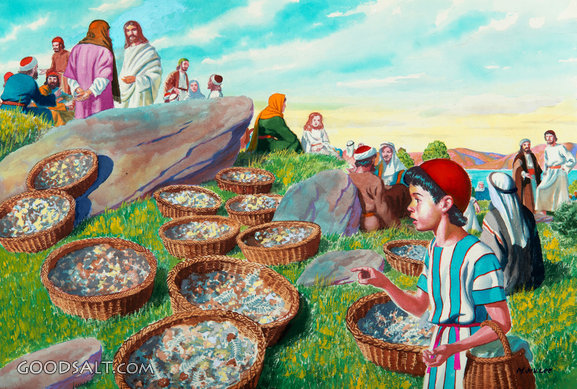 The Boy's Lunch - Twelve Baskets of Leftovers John 6:9-10 boy, multitude, gathering, loaves and fishes, feeding five thousand, leftovers, rhpas0325, counts PROJECTION - License for PowerPoint™ PRINT – buy a print of this picture; optional frame Bible Hub |