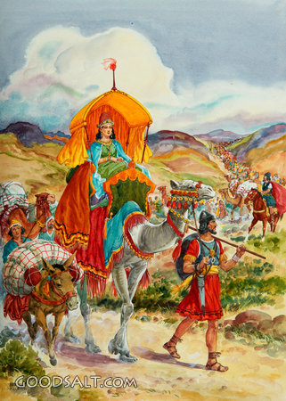 The Queen of Sheba Viaits Solomon 1 Kings 10:1-13 uniform, canopy, soldier, caravan, queen, sheba, of, 5, gold, camel, on, spices, camels, with, jewels, rhpas0630, tons PROJECTION - License for PowerPoint™ PRINT – buy a print of this picture; optional frame Bible Hub |