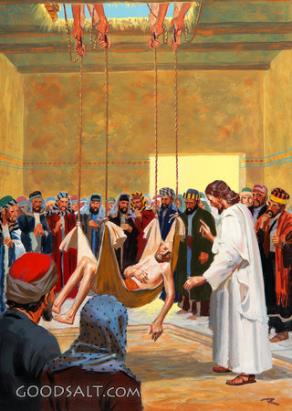 Healing a Man With Palsy Luke 5:17-26 Jesus, healing, sick, miracle, held, hole, man, men, crowd, healed, bed, five, roof, palsy, and, friends, miracles, in, ropes, heals, paul remmey, jesus healing, sick man, pity, by, him, had, rhpas0735 PROJECTION - License for PowerPoint™ PRINT – buy a print of this picture; optional frame Bible Hub |