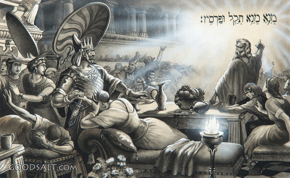 Hand Writing on the Wall Daniel 5:25-28 party, warning, pride, Belshazzar, black and white, finger of god, king of babylon, robert eldridge, win, possesions, unholy PROJECTION - License for PowerPoint™ PRINT – buy a print of this picture; optional frame Bible Hub |