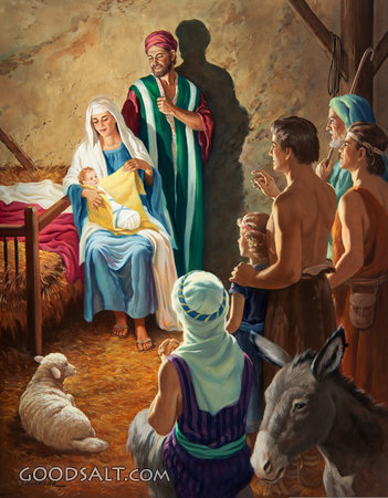 Visit of the Shepherds Luke 2:15-20 nativity, lamb, manger, bethlehem, shepherds, clyde provonsha, baby jesus, mary and joseph, golden treasury, bsnt205nativity001ccp, k-1846, bb-11202 PROJECTION - License for PowerPoint™ PRINT – buy a print of this picture; optional frame Bible Hub |