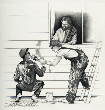 God of Joy 1 John 4:8 joy, modern, christ, black, Jesus, painting, work, working, white, house, ladder, paint, smile, smiling, laugh, window, workers, graphite, black & white, overalls, rhpas1165, god of joy PROJECTION - License for PowerPoint™ PRINT – buy a print of this picture; optional frame Bible Hub |