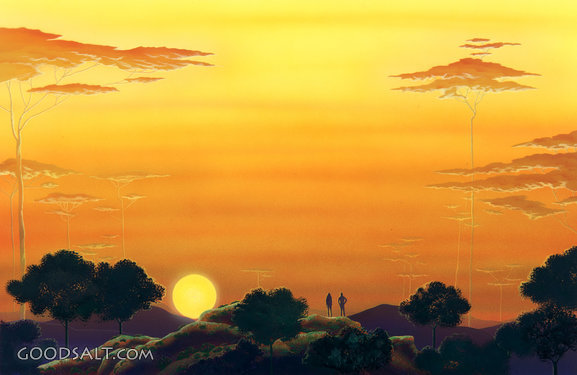 The First Day Genesis 1:1-5 creation, sunset, adam and eve, garden of eden, paul turnbaugh, forever stories, kl-256, bbl-573, fsv.1_p36_37creation005cpt, review & herald PROJECTION - License for PowerPoint™ PRINT – buy a print of this picture; optional frame Bible Hub |