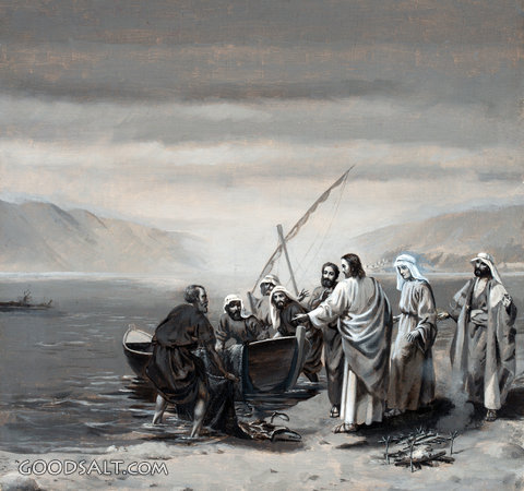 Jesus Reunites With the Disciples on the Shore John 21:7-12 Jesus, sea, boat, meal, galilee, fish, disciples, black and white, rhpas3006, cast your nets PROJECTION - License for PowerPoint™ PRINT – buy a print of this picture; optional frame Bible Hub |
