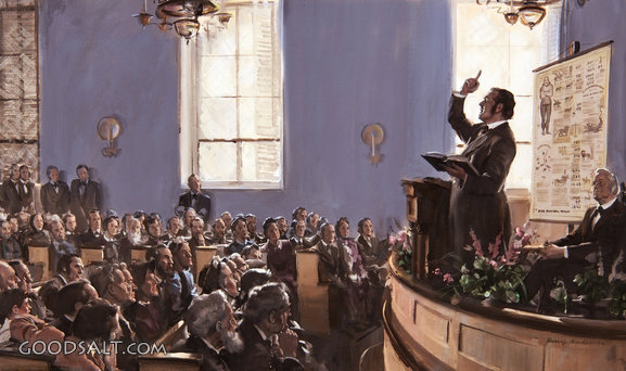 William Miller's Message Daniel 8:14 meeting, listening, preaching, preach, pulpit, congregation, interior, poster, church, preacher, revelation, message, reveal, harry anderson, William, pews, 1844, miller, colorized, new england, great awakening, great disappointment, evangelistic PROJECTION - License for PowerPoint™ PRINT – buy a print of this picture; optional frame Bible Hub |