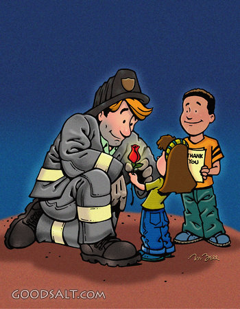 you, thank, girl, boy, man, rose, gift, fireman, firefighter, smile, smiling, red