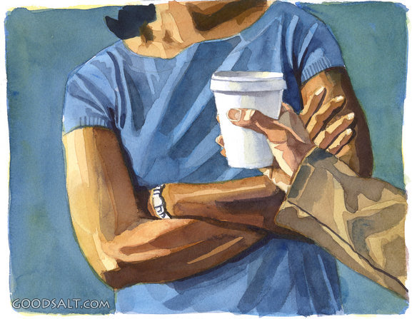people, offer, give, deny, drink, woman, hand, coffee, cup
