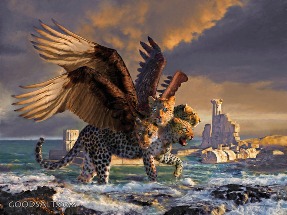 water, sea, storm, four, prophecy, beast, leopard, greece, ruins, wings, heads, prophecyart