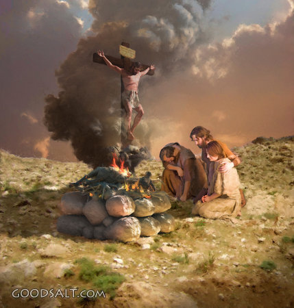 Sacrifice John 1:36 1 Peter 1:18-19 1 Corinthians 5:7 Jesus, kneeling, substitute, animal, hillside, woman, man, men, lamb, smoke, altar, slain, contrite, sacrifice, offering, easter, stones, propitiation PROJECTION - License for PowerPoint™ PRINT – buy a print of this picture; optional frame Bible Hub |