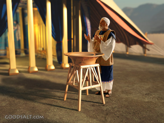 Sanctuary - Laver With High Priest Exodus 30:18 wash, water, priest, sanctuary, high, cleanse, courtyard, wilderness, tabernacle, basin, laver, pafurniture, washbasin, prophecyart PROJECTION - License for PowerPoint™ PRINT – buy a print of this picture; optional frame Bible Hub |