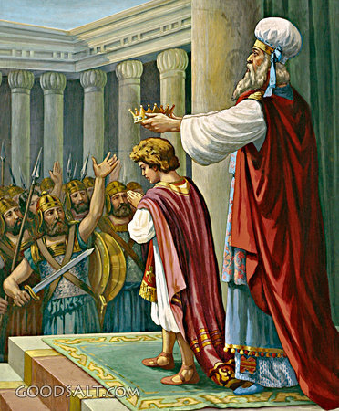 Joash the Boy King Crowned 2 Kings 11 2 Chronicles 23 salvation, god, history, royal, boy, crown, king, throne, jehoiada, joash, prophecy, discipleship, family, judah, love, commandments, Jehoash, Athaliah PROJECTION - License for PowerPoint™ PRINT – buy a print of this picture; optional frame Bible Hub |