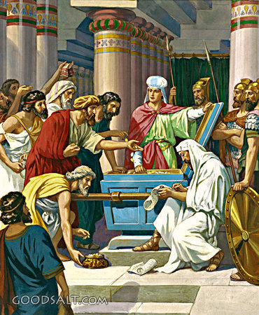Joash Repairs the Temple 2 Kings 12:1-16 2 Chronicles 24:1-14 history, temple, money, king, jehoiada, joash, prophecy, sin, discipleship, tax, love, commandments, priests, Levites, repair, Jehoash PROJECTION - License for PowerPoint™ PRINT – buy a print of this picture; optional frame Bible Hub |