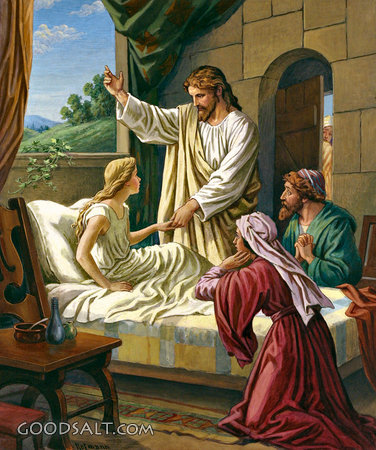 Jairus' Daughter Restored to Life Matthew 9:18 Matthew 9:23-26 Mark 5:21-24 Mark 5:35-43 Luke 8:40-42 Luke 8:49-56 raised, Jesus, healing, life, death, jairus, synagogue, daughter, resurrection, Talitha, koum PROJECTION - License for PowerPoint™ PRINT – buy a print of this picture; optional frame Bible Hub |