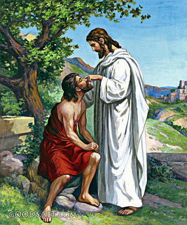 Jesus Heals the Blind Mark 8:22-26 John 9:1-12 blind, witnessing, god, Jesus, healing, miracle, restore, sent, spit, faith, prophecy, bethesda, commandments, sight, Siloam PROJECTION - License for PowerPoint™ PRINT – buy a print of this picture; optional frame Bible Hub |
