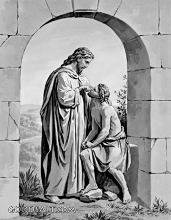 Jesus Heals the Blind Mark 8:22-26 John 9:1-12 blind, witnessing, god, Jesus, healing, miracle, restore, sent, spit, faith, prophecy, bethesda, commandments, sight, Siloam PROJECTION - License for PowerPoint™ PRINT – buy a print of this picture; optional frame Bible Hub |