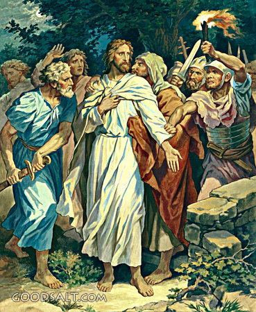 Arrest and Trial of Jesus Matthew 26:47-56 Mark 14:43-50 Luke 22:47-53 John 18:2-11 god, Jesus, kiss, betray, history, judas, faith, arrest, prophecy, gethsemane, sin, easter, iscariot, disciples, soldiers, swords, passion week PROJECTION - License for PowerPoint™ PRINT – buy a print of this picture; optional frame Bible Hub |