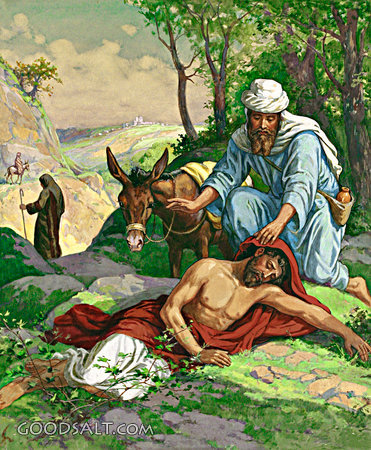 Good Samaritan Luke 10:25-37 salvation, Jesus, parable, samaritan, levite, history, priest, thieves, eternal, neighbor, jericho, love, commandments, robbers PROJECTION - License for PowerPoint™ PRINT – buy a print of this picture; optional frame Bible Hub |