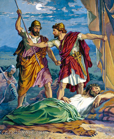 David Spares Saul 1 Samuel 26 witnessing, salvation, asleep, history, saul, deliverance, faith, spear, mercy, king, david, respect, love, Abishai, vengeance PROJECTION - License for PowerPoint™ PRINT – buy a print of this picture; optional frame Bible Hub |