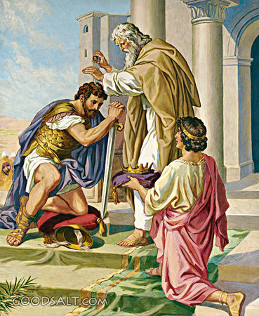 David Anointed King of Judah and Israel 2 Samuel 5:1-5 1 Chronicles 11:1-3 history, shepherd, ruler, king, prophecy, oil, anoint, israel, david, judah, elders, Hebron PROJECTION - License for PowerPoint™ PRINT – buy a print of this picture; optional frame Bible Hub |