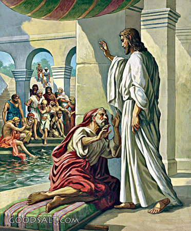 Jesus at the Pool of Bethesda John 5:1-18 angel, witnessing, walk, water, god, Jesus, pool, mat, miracle, sabbath, history, sin, lame, bethesda, commandments PROJECTION - License for PowerPoint™ PRINT – buy a print of this picture; optional frame Bible Hub |