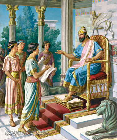 Daniel and Friends Before King Daniel 1 witnessing, salvation, history, food, daniel, prophecy, wine, abednego, meshach, shadrach, nebuchadnezzar, discipleship, love, hananiah, mishael, azariah, commandments PROJECTION - License for PowerPoint™ PRINT – buy a print of this picture; optional frame Bible Hub |