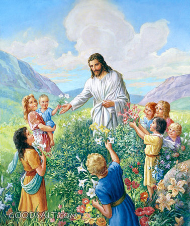 Jesus and the Children Among Lilies Matthew 19:13-15 Mark 10:13-16 Luke 18:15-17 salvation, Jesus, bless, suffer, history, heaven, faith, kingdom, allow, family, little, children, disciples, forbid PROJECTION - License for PowerPoint™ PRINT – buy a print of this picture; optional frame Bible Hub |