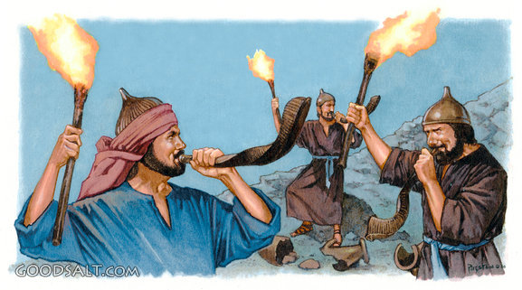 Gideon's Men Blow Horns Judges 7:19-20 miracle, blow, blowing, attack, trumpet, battle, men, torch, jericho, horn, gideon, army, torches, trumpets, horns, jeff preston, gideon's PROJECTION - License for PowerPoint™ PRINT – buy a print of this picture; optional frame Bible Hub |