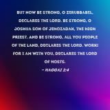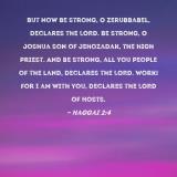 But now be strong, O Zerubbabel, declares the LORD. Be strong, O Joshua son of Jehozadak, the high priest. And be strong, all you people of the land, declares the LORD. Work! For I am with you, declares the LORD of Hosts.