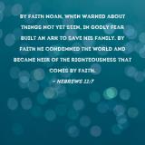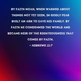 By faith Noah, when warned about things not yet seen, in godly fear built an ark to save his family. By faith he condemned the world and became heir of the righteousness that comes by faith.