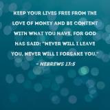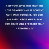 Keep your lives free from the love of money and be content with what you have, for God has said: "Never will I leave you, never will I forsake you."