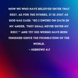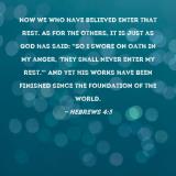 Now we who have believed enter that rest. As for the others, it is just as God has said: "So I swore on oath in My anger, 'They shall never enter My rest.'" And yet His works have been finished since the foundation of the world.