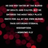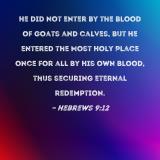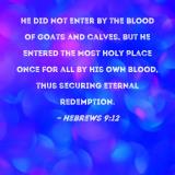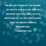 He did not enter by the blood of goats and calves, but He entered the Most Holy Place once for all by His own blood, thus securing eternal redemption.